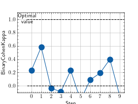 >>> from torch import rand, randint >>> # Example plotting multiple values >>> from torchmetrics.classification import BinaryCohenKappa >>> metric = BinaryCohenKappa() >>> values = [ ] >>> for _ in range(10): ... values.append(metric(rand(10), randint(2,(10,)))) >>> fig_, ax_ = metric.plot(values)