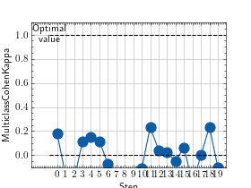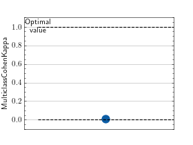 >>> from torch import randn, randint >>> # Example plotting a multiple values >>> from torchmetrics.classification import MulticlassCohenKappa >>> metric = MulticlassCohenKappa(num_classes=3) >>> values = [] >>> for _ in range(20): ... values.append(metric(randn(20,3).softmax(dim=-1), randint(3, (20,)))) >>> fig_, ax_ = metric.plot(values)