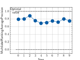>>> from torch import rand, randint >>> # Example plotting multiple values >>> from torchmetrics.classification import MultilabelRankingAveragePrecision >>> metric = MultilabelRankingAveragePrecision(num_labels=3) >>> values = [ ] >>> for _ in range(10): ... values.append(metric(rand(20, 3), randint(2, (20, 3)))) >>> fig_, ax_ = metric.plot(values)