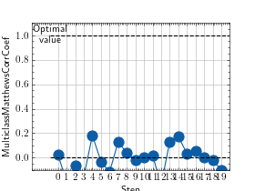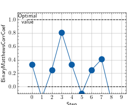>>> from torch import rand, randint >>> # Example plotting multiple values >>> from torchmetrics.classification import BinaryMatthewsCorrCoef >>> metric = BinaryMatthewsCorrCoef() >>> values = [ ] >>> for _ in range(10): ... values.append(metric(rand(10), randint(2,(10,)))) >>> fig_, ax_ = metric.plot(values)