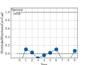 >>> from torch import rand, randint >>> # Example plotting multiple values >>> from torchmetrics.classification import MultilabelMatthewsCorrCoef >>> metric = MultilabelMatthewsCorrCoef(num_labels=3) >>> values = [ ] >>> for _ in range(10): ... values.append(metric(randint(2, (20, 3)), randint(2, (20, 3)))) >>> fig_, ax_ = metric.plot(values)