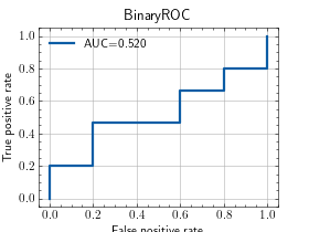>>> from torch import rand, randint >>> from torchmetrics.classification import BinaryROC >>> preds = rand(20) >>> target = randint(2, (20,)) >>> metric = BinaryROC() >>> metric.update(preds, target) >>> fig_, ax_ = metric.plot(score=True)