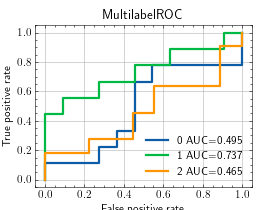 >>> from torch import rand, randint >>> from torchmetrics.classification import MultilabelROC >>> preds = rand(20, 3) >>> target = randint(2, (20,3)) >>> metric = MultilabelROC(num_labels=3) >>> metric.update(preds, target) >>> fig_, ax_ = metric.plot(score=True)