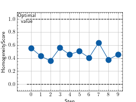 >>> # Example plotting multiple values >>> import torch >>> from torchmetrics.clustering import HomogeneityScore >>> metric = HomogeneityScore() >>> values = [ ] >>> for _ in range(10): ... values.append(metric(torch.randint(0, 4, (10,)), torch.randint(0, 4, (10,)))) >>> fig_, ax_ = metric.plot(values)